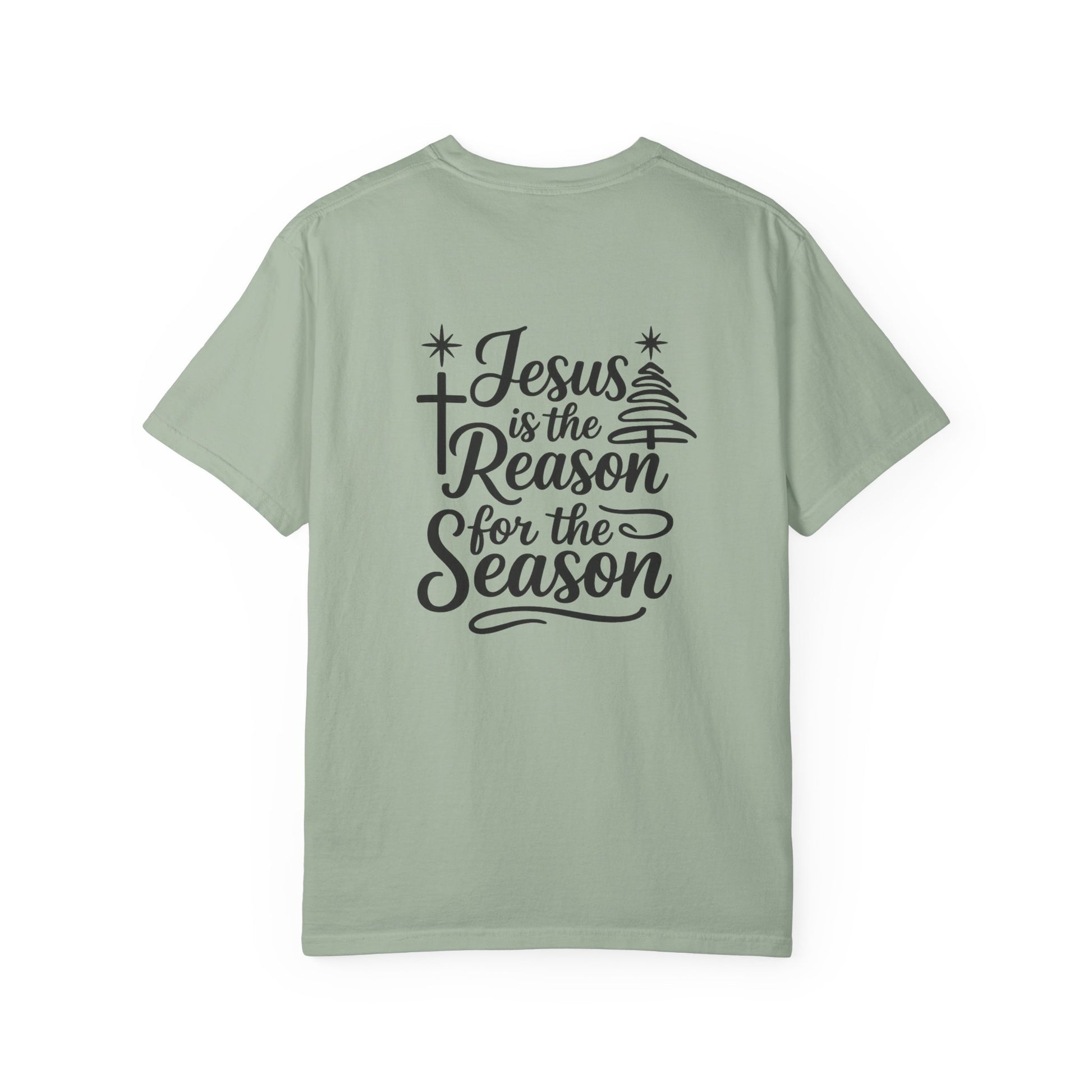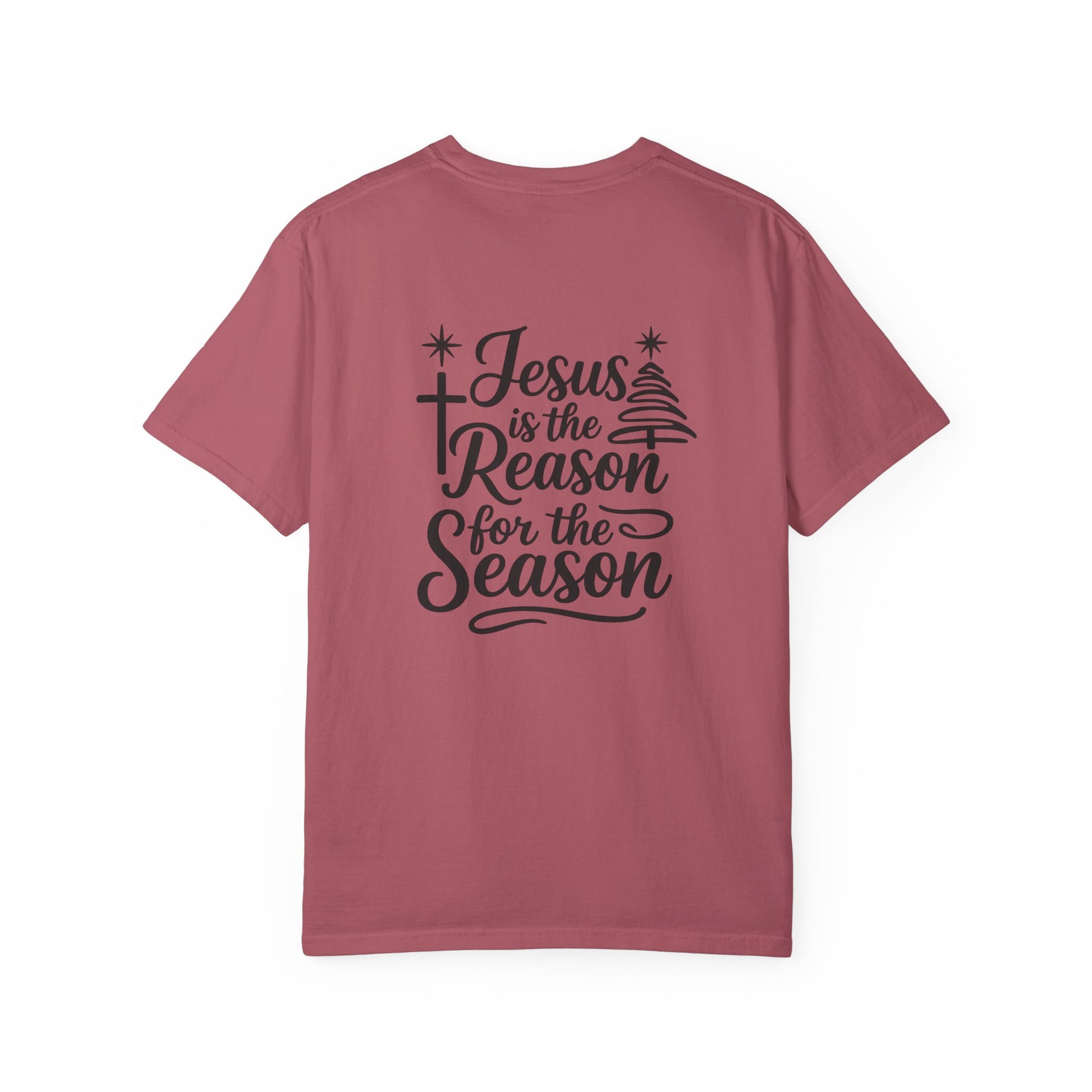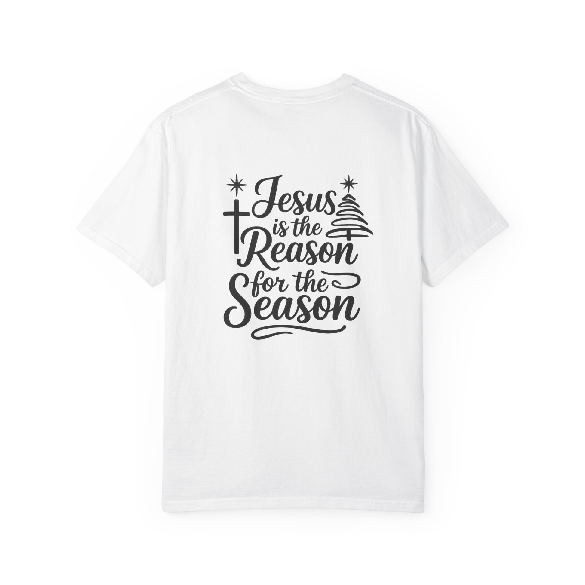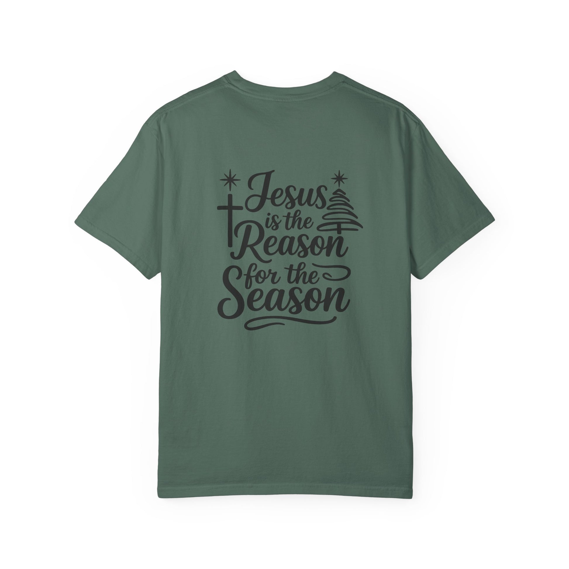 Soft, garment-dyed cotton with a relaxed fit that carries a quiet, heartfelt message. This tee settles in like an old friend — breathable, slightly textured from the post-construction dye, and sturdy where it counts. On the back, hand-lettered script and subtle seasonal accents read “Jesus is the Reason for the Season,” a calm reminder worn with intention. Slip it on for chilly evenings at church socials, family carol nights, or while wrapping gifts by lamplight. It layers easily under a flannel or over a thermal, and the tubular knit gives a clean silhouette without side seams. Each wash softens the color and the feel, making this shirt one you’ll reach for again and again.