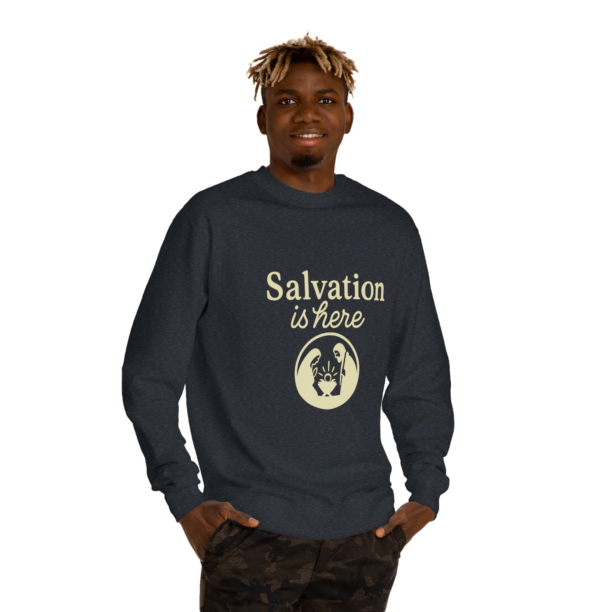 Soft, steady, and quietly confident — this crew neck sweatshirt carries a gentle message without shouting. A minimalist emblem sits centered on the chest with the words “Salvation is here” paired with a calm, nature-inspired seal in deep green. The feel is familiar: medium-heavy fleece that warms on cool mornings, a ribbed collar and cuffs that keep shape, and a tear-away label for comfortable layering. Wear it to church gatherings, early volunteer shifts, or slow walks where reflection feels right. It blends into daily life while speaking to what matters most — hope, rest, and quiet faith.